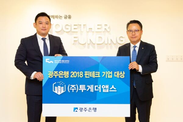 광주은행은 2018 핀테크 기업 대상에 '㈜투게더앱스(대표 김항주)'를 선정하고 송종욱 행장을 비롯한 임직원들이 테헤란로에 위치한 ㈜투게더앱스 본사를 직접 방문해 시상했다고 28일 밝혔다.