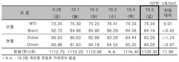 6일 한국석유공사에 따르면 5일(현지시간) 뉴욕상업거래소(NYMEX)의 미국 서부텍사스산원유(WTI) 가격은 전일 대비 배럴당 0.01달러 상승한 74.34달러를 기록했다.
