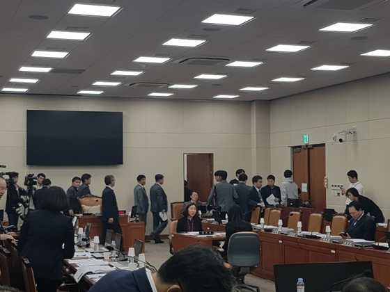오후 2시 속개된 국감에서 여당인 더불어민주당 의원들은 곧바로 한국당의 성명서 내용에 강도 높은 이의를 제기했다.