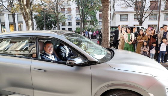 현대차는 문 대통령 내외가 14일(현지시간) 오후 프랑스 시내에서 현대자동차의 넥쏘 수소전기차를 직접 탑승했다고 15일 밝혔다.