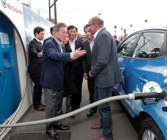 프랑스를 국빈 방문 중인 문재인 대통령이 파리 도심에서 수소전기차인 넥쏘를 시승하면서 세계 최초로 양산차를 개발했지만 충전소 규제로 활성화에 발목이 잡힌 국내 상황이 재부각되고 있다.