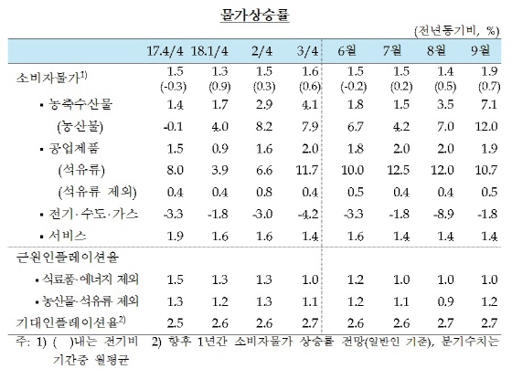 소비자물가는 농산물가격 상승세 확대, 전기요금 한시 인하 종료 등으로 오름세가 1%대 후반으로 높아졌다.