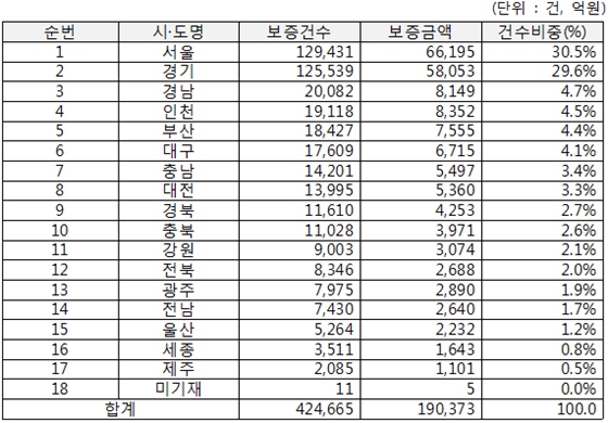 이를 연도별로 살펴보면 △2015년 10만6984건(3조9010억원) △2016년 10만3320건(4조1675억원) △2017년 11만2976건(5조3786억원) △2018년 9월까지 10만1385건(5조5901억원)으로 매년 증가 추세를 나타냈다. 서울이 총 12만9431건(6조6195억원, 30.5%)으로 가장 많았다.