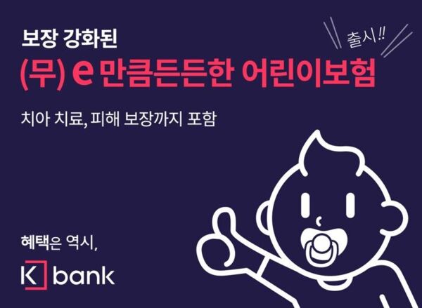 케이뱅크는 기존 어린이보험보다 보장이 더욱 강화된 ABL생명의 '(무)e만큼든든한어린이보험' 모바일슈랑스 상품을 선뵌다고 22일 밝혔다.