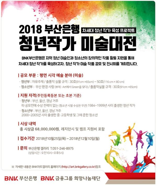 BNK부산은행은 창립 51주년을 맞아 부울경(부산·울산·경남) 지역 차세대 청년 작가 육성 프로젝트의 일환으로 '청년작가 미술대전'을 개최한다고 25일 밝혔다.