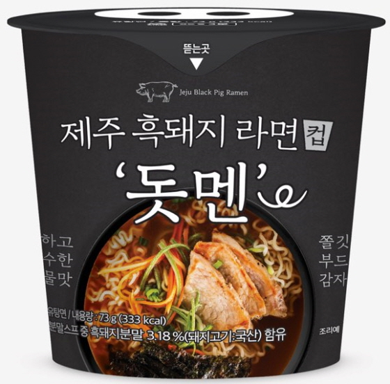 제주 흑돼지 컵라면 ‘돗멘’은 돼지를 뜻하는 제주어 ‘돗’과 라면의 ‘멘’을 합성했다. 분말스프 원료로 제주 흑돼지를 사용해 진하고 칼칼하며 구수한 맛을 내는 것이 특징이다.
