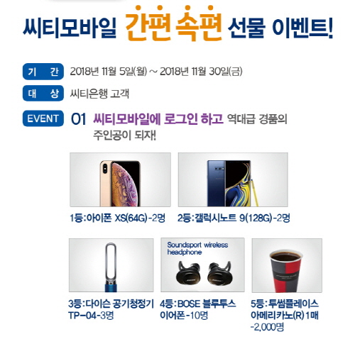 이번 행사는 5일부터 30일까지 모바일 앱에 로그인 한 씨티은행 고객을 대상으로 시행된다. 추첨을 통해 아이폰 XS(2명), 갤럭시노트9(2명), 다이슨공기청정기(3명), 보스 사운드스포츠 와이어리스(BOSE SoundSport Wireless) 이어폰(10명), 투썸플레이스 아메리카노 모바일 상품권(2000명)등이 제공되며 로그인 시 경품 추첨에 자동 응모된다.
