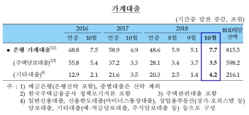 한국은행이 13일 발표한 '2018년 10월 중 금융시장 동향'을 보면 지난달 은행의 가계대출은 7조7000억원 증가한 815조5000억원을 기록했다. 이는 2016년 11월(8조8000억원) 이후 최대 규모다.