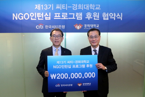 한국씨티은행이 경희대학교와 '제13기 씨티-경희대학교 NGO 인턴십 프로그램' 후원 협약식을 갖고 2억원의 후원금을 전달 했다.