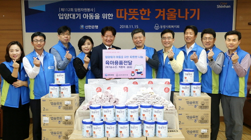 신한은행 임직원들은 바쁜 일상 속에서도 정성을 담아 만든 아기손수건, 턱받이 등 아기물품과 분유를 동방사회복지회에 기부 하는 등 영아일시보호소의 영아에 대한 따뜻한 사랑나눔을 실천했다