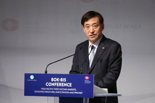 19일 이 총재는 한국은행과 국제결제은행(BIS)이 공동으로 개최한 '아태지역 채권시장의 구조, 참가자 및 가격 형성' 국제콘퍼런스 개회사를 통해 "아태지역 채권시장의 발달이 어려움을 일으키기도 했다"며 "외국인 투자자의 역내 채권 보유 비중이 높아짐에 따라 채권금리가 자국의 경제 상황이나 통화정책 외에도 글로벌 요인에 크게 영향을 받게 됐다"고 말했다.