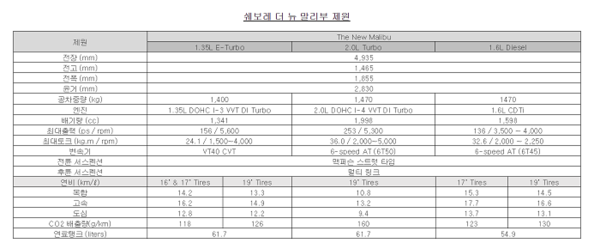 신형 말리부는 GM의 첨단 라이트사이징(Rightsizing)기술을 적용해 동급 최고 연비를 실현한 1.35리터 직분사 가솔린 E- Turbo 엔진을 탑재했다. 뛰어난 정숙성과 토크 성능을 발휘하는 1.6리터 디젤 엔진도 새롭게 추가했다.
