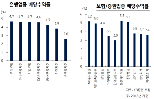 26일 KB증권은 금융주로 분류되는 2018년 기준 배당수익률이 가장 높은 곳으로 우리은행 (4.7%)과 하나금융지주(4.7%) 및 기업은행(4.7%)을 꼽았다. 이어 DGB금융지주(4.6%), BNK금융지주(4.3%), 신한지주(3.9%), JB금융지주(2.6%)로 추산했다. 은행주의 평균 배당수익률은 4.5%에 달하는데, 전문가들은 양호한 실적의 은행주가 하락장에서 수익률 방어 효과를 낸다고 평가했다.