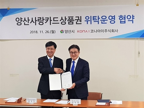 코나아이는 경남 양산시와 함께 코나카드 플랫폼 기반 전국 기초자치단체 최초 카드형상품권 '양산사랑카드'를 발행한다고 26일 밝혔다. 양산시는 기존 지류형상품권의 경우 별도 가맹점 모집이 필요하고 실제 가맹점에게 별다른 혜택이 없는 점 등 효율성이 낮아 이번에 카드형상품권을 도입하게 됐다.