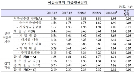 예금금리가 대출금리보다 큰 폭으로 오르면서 10월 예금금리와 대출금리의 차는 1.71%포인트로 전월대비 0.06%포인트 줄었다.