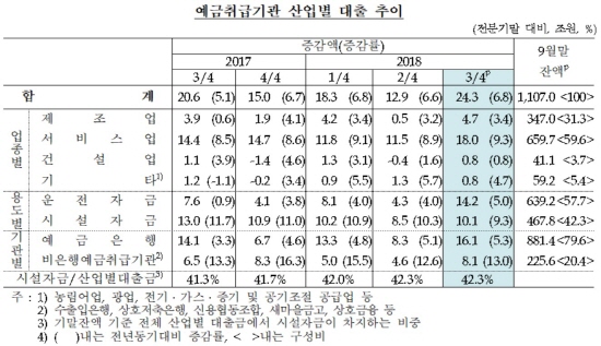 한국은행이 29일 발표한 '2018년 3분기 중 예금취급기관 산업별 대출금'에 따르면 올 3분기 중 예금취급기관 산업별 대출 잔액은 전 분기보다 24조3000억원 증가한 1107조원으로 집계됐다.