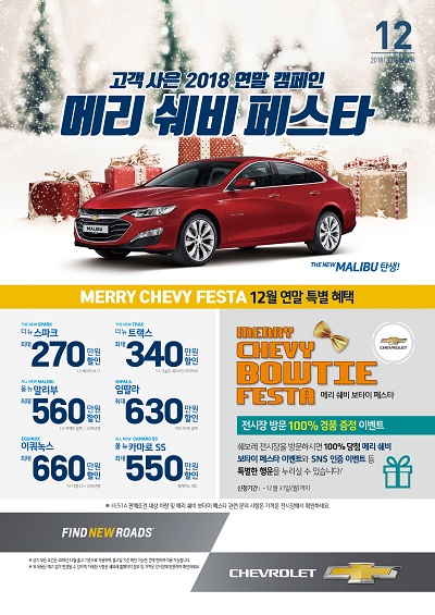 한국지엠은 12월 한 달간 ‘메리 쉐비 페스타’ 프로모션을 진행해 대대적인 할인에 나선다.