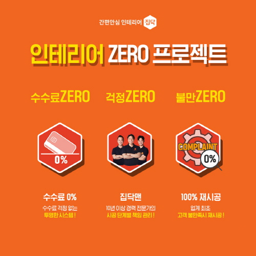 이번 프로젝트는 크게 세가지로 구성됐다. 고객과 시공업체간 수수료에 대한 불신을 투명화하기 위한 목적의 '수수료 제로'와 10년 이상의 인테리어 전문가인 집닥맨이 시공 현장을 방문해 단계별로 공사 상황을 감리하고 해결해주는 '걱정 제로', 고객이 체결했던 계약조건과 공사 결과가 상이할 경우 이를 대신 책임지고 100% 재시공해주는 '불만 제로'가 있다.