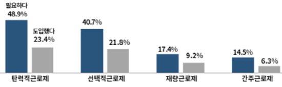 탄력근로제의 활용률은 높지 않았다. 탄력근로제 도입여부에 대해 묻자 '실제 도입했다'는 응답은 23.4%에 그쳤다. 선택근로제, 재량근로제, 간주근로제 등 다른 유연근무제도도 필요성에 비해 실제 활용률은 아직 낮은 것으로 나타났다.