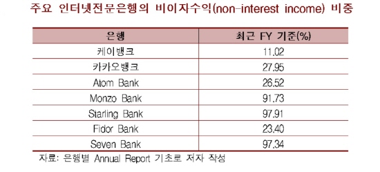 반면, 우리나라는 기존 은행뿐만 아니라 현재의 인터넷전문은행들도 이자수익 중심의 수익구조를 가지고 있어 비즈니스 다변화가 시급하다. 해외 인터넷전문은행의 경우 은행마다 차별성이 있어 일부 은행의 비이자수익 비중이 90%를 초과하기도 한다.