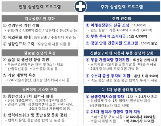 현대차그룹은 총 1조 6728억원 규모의 상생협력 프로그램을 추진한다. 협력사의 경영 안정화 및 신기술 투자 등의 지원을 위한 '미래성장펀드'를 신규로 조성하고 협력사의 부품 연구.개발(R&D) 및 양산 투자비를 조기 지급한다. 중소.중견 부품업체 경영 안정화 긴급 지원을 위한 별도의 프로그램도 추진할 예정이다.