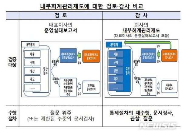 수행절차 역시 ‘검토’는 감사인이 회사의 내부통제에 대해 담당자와의 질문 위주의 검증절차를 수행한다. ‘감사’는 내부통제와 관련해 회사가 작성한 문서를 검사하고 중요한 통제 활동에 대해 재수행하거나 회사의 통제 활동을 현장에서 지켜봐야 한다.