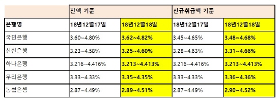 변동대출 금리 조정은 전날 은행연합회가 공시한 11월 잔액 및 신규취급액 기준 코픽스 상승 때문이다.