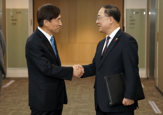 홍 부총리와 이 총재는 낮 12시 서울 중구 세종대로 한은 본관에서 만나 오찬 회동을 했다. 이 자리에는 이호승 기재부 1차관, 윤면식 한은 부총재가 배석했다.