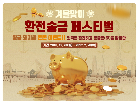 페스티벌 기간 환전·송금 고객을 대상으로 경품 증정 이벤트도 실시한다. 100만원 상당 황금돼지 모형(1명), 20만원 상당 미니골드바(5명), 일본호텔 숙박권(6명), 미니가습기(70명), 캐리어커버(500명)등 총 582명에게 경품을 제공할 예정이다.