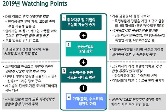 연구소는 2019년 금융산업이 2년여의 짧은 회복기를 지나 새로운 하강국면에 진입할 것으로 예상했다.