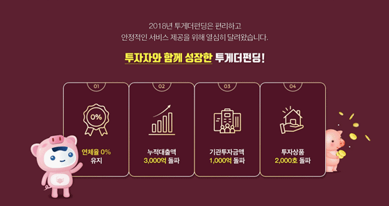 아울러 투게더펀딩은 올해 투자상품 2000호 돌파, 기관투자 1000억원 돌파 등의 기록을 세웠으며 토스·핀크 등 타 금융플랫폼과 연계 서비스, 업계 최초 지점 설립, 광주은행 핀테크 대상 수상 등 결실을 맺었다.