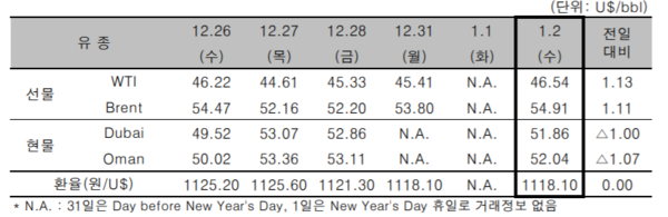 3일 한국석유공사에 따르면 2일(현지시간) 뉴욕상업거래소(NYMEX)에서 거래된 미국 서부텍사스산원유(WTI)는 전일대비 배럴당 1.13달러 오른 46.54달러에 거래를 마쳤다.