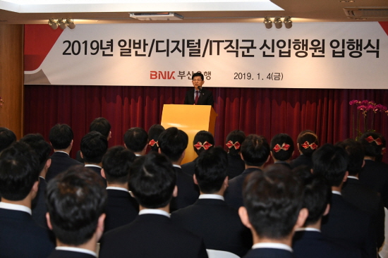 BNK부산은행은 4일 오전, 부산은행 본점 23층에서 신입행원 57명과 함께 '2019년 일반/디지털/IT직군 신입행원 입행식'을 가졌다.