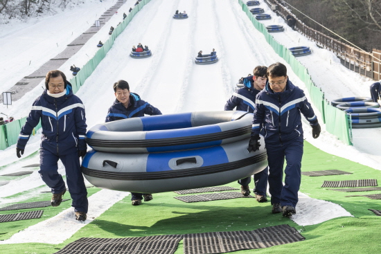 정 대표 및 임직원들은 이곳에서 고객들의 안전을 위해 눈썰매 튜브를 잡거나 아르바이트 근무자들과 함께 대형 눈썰매를 나르며 개선책을 논의했다.