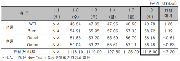 9일 한국석유공사에 따르면 8일(현지시간) 뉴욕상업거래소(NYMEX)에서 거래된 WTI(서부텍사스산원유)는 전일대비 배럴당 1.26달러 오른 49.78달러를 기록했다.