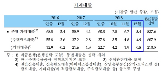 신용대출과 마이너스통장 등 기타대출은 연말 성과급 등의 영향을 받아 5000억원 증가에 그쳤으나 주택담보대출은 4조9000억원 늘어 증가액이 전월(4조8000억원)보다 확대됐다. 주담대 증가액은 연중 최대치이자 지난 2016년 11월(6조1000억원) 이후 2년1개월 만에 가장 많았다.