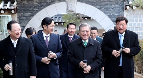문 대통령은 이날 오후 청와대 영빈관에서 22명의 대기업 대표, 39명의 중견기업 대표를 비롯한 기업인들과 만나 대화를 나눈 뒤 이들 중 9명과 별도로 시간을 마련해 청와대 경내를 산책했다.