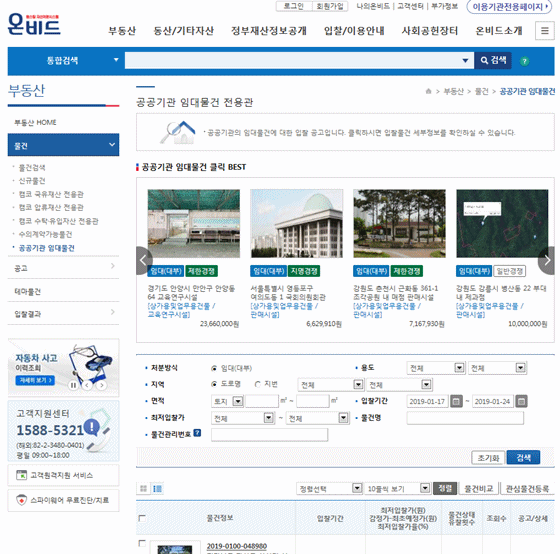 캠코(한국자산관리공사)는 공공자산 처분시스템 온비드에 공공기관 보유 점포, 매점 등 수익형 부동산 임대 전용 페이지인 '공공기관 임대물건 전용관'을 개설했다고 21일 밝혔다.