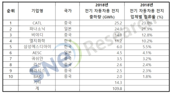 기업별로 중국의 CATL이 25.2GWh의 전기차용 2차전지를 출하해 시장점유율 23%로 1위를 기록했다. 일본의 파나소닉과 중국의 BYD는 각각 21.9%, 12.8%로 2, 3위에 올랐다.