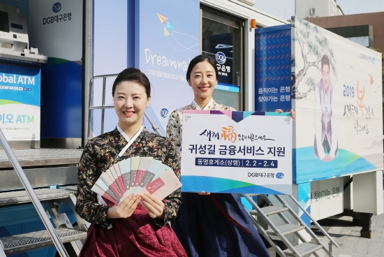 대구은행 관계자는 "민족 대이동의 설명절을 맞아 귀향 고객 불편을 최소화하기 위해 DGB무빙뱅크 운영, 지역경제 활성화를 위한 전통시장 이용 장려를 위한 다양한 고객 서비스를 진행하게 됐다"고 말했다.