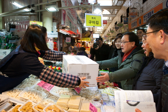 ▶ 유영민 과학기술정보통신부 장관이 28일 오후 설을 맞아 경기도 군포시 산본시장을 방문해 매화종합사회복지관(사회복지시설)에 전달할 위문물품을 구매하고 있다.ⓒ과기정통부 유영민 과학기술정보통신부 장관은 28일 경기 군포시에 위치한 산본시장을 방문해 사회복지시설에 전달할 물품을 직접 구입하면서 시장 경기상황을 살펴보고 전통시장 현대화 등 활성화 방안에 대해 상인들의 의견을 청취했다. 이어 유 장관은 인근에 위치한 매화종합사회복지관을 방문해 시장에서 구입한 물품과 과기정통부 직원들이 매월 모금한 성금을 전달했다. 또 군포우체국을 방문해 설 명절 우편물 특별소통 현황을 점검하고 소포 분류작업장 등을 돌아봤다. 유 장관은 이 자리에서 "추운 날씨에 건강관리에 유념하고 단 한 건의 사고도 없이 설 명절 우편물이 제 때 배달될 수 있도록 최선을 다해달라"고 당부했다.