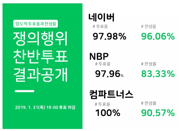 투표율과 찬성률은 네이버 법인 97.98%(찬성 96.06%), NBP 97.96%(찬성 83.33%), 컴파트너스 100%(찬성 90.57%)를 기록했다. 네이버 노조는 관할 노동청 등에 쟁의행위 신고서를 제출한 뒤 쟁의행위에 나설 수 있게 됐다. 즉 파업 등을 포함한 쟁의행위에 돌입할 수 있다는 얘기다.