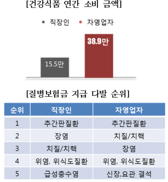 카드사 통계에서 나타난 소비패턴에서도 인삼 등 건강식품 구매에 쓴 돈이 직장인은 연간 15만5000원, 자영업자는 38만9000원이다.