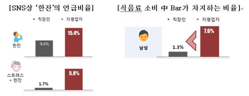 소주, 맥주, 혼술 등 '한잔'과 관련된 단어가 언급된 비율이 직장인은 9.4%, 자영업자는 15.4%로 나타났다. 이런 단어를 '스트레스'와 함께 언급한 비율도 직장인은 1.7%, 자영업자는 5.8%다.