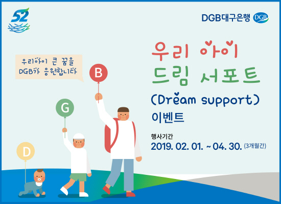 DGB대구은행은 지역 미래세대를 응원하고 청소년들의 올바른 경제관념 장려를 위해 DGB대구은행 유소년 상품에 가입하는 고객을 대상으로 다양한 경품을 추첨, 제공하는 '우리 아이 드림 서포트' 이벤트를 진행한다고 밝혔다.