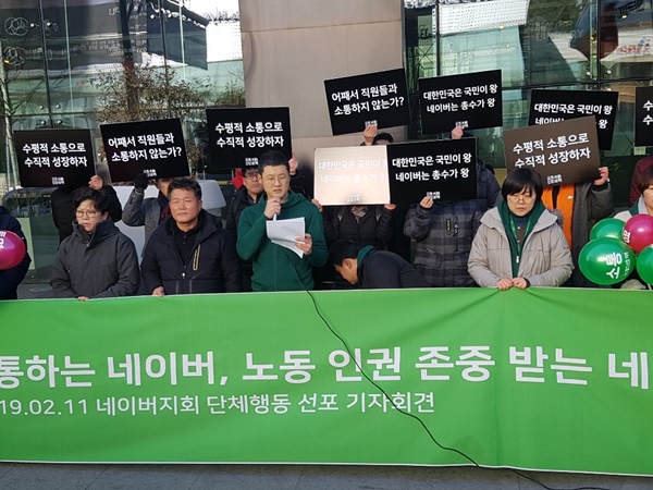▶ ⓒEBN 조재훈 기자 오세윤 네이버 노조 '공동성명' 지회장(앞줄 왼쪽에서 3번째)이 11일 경기 성남 네이버 사옥 앞에서 "적당히 타협하고 물러설 수 없다"며 "20일 이후 첫 쟁의행위에 돌입하겠다"고 발언하고 있다. ▶ ⓒEBN