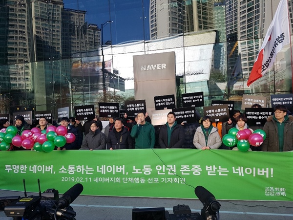 오세윤 네이버 노조 '공동성명' 지회장은 11일 경기도 성남시 분당구 네이버 본사 앞에서 열린 기자회견에서 "회사가 지금과 같이 노동 3권을 무시하는 태도를 지속하고 대화의 창을 열지 않는다면 결국 노조는 가장 강력한 단체행동권을 고민할 수밖에 없는 상황이 될 것"이라며 "이 경우 파업은 회사가 선택한 결론"이라고 강조했다.