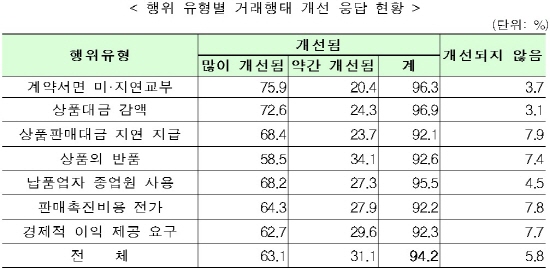 행위 유형별로는 △상품대금 감액(96.9%) △계약서면 미·지연 교부(96.3%) △납품업자 종업원 사용(95.5%) 등에서 관행이 개선됐다.