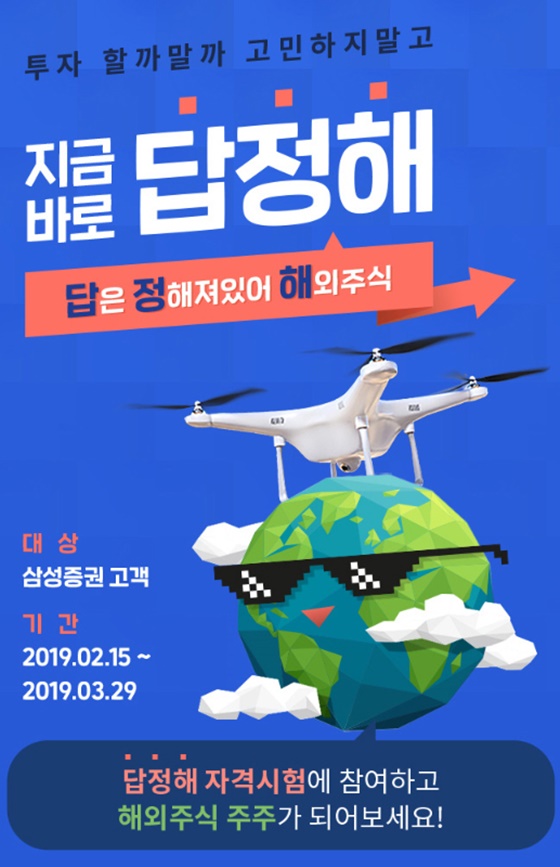 삼성증권은 다음달 29일까지 해외주식 관련 퀴즈에 참여하고 정답을 맞힌 고객을 대상으로 다양한 혜택을 제공하는 '답은 정해져있어, 해외주식!(답정해)' 이벤트를 진행한다고 밝혔다.