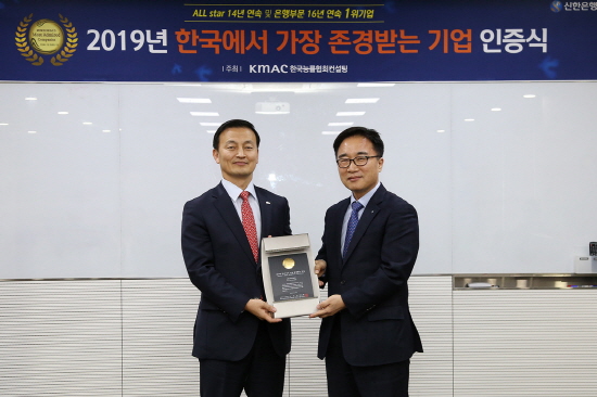 신한은행은 한국능률협회컨설팅(KMAC)에서 실시한 '2019년 한국에서 가장 존경받는 기업'조사에서 16년 연속 은행산업부문 1위 및 14년 연속 All star(전체 기업 중 상위 30위 기업) 기업으로 선정됐다고 19일 밝혔다.
